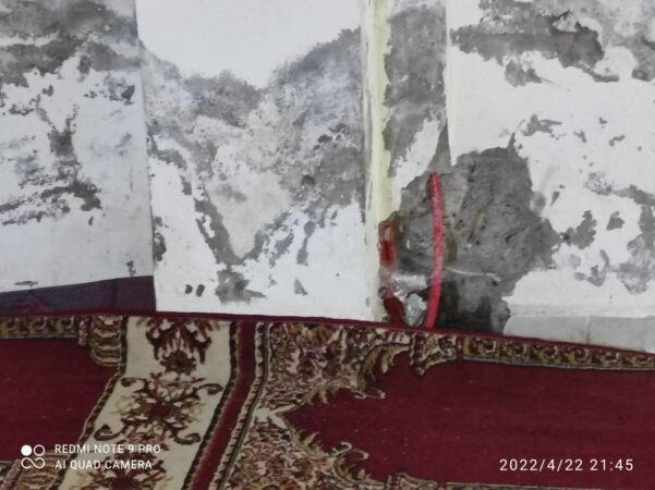 هذا المسجد يتكون من طابق سفلي وطابقين علويين وطابق تحت أرضي، هذا الأخير يوجد في حالة يرثى لها حيث يوجد ثقب مائي بأحد قنوات الماء المزودة للمسجد بالجانب الخلفي للطابق تسبب في تكون بركة مائية بالركن الخلفي للطابق حيت تسبب هاته المياه في وجود رطوبة عالية بالمكان مما أدى إلى ظهور بقع سوداء بالجدران الشى الذي أدى الى وجود رائحة مؤذية تولد مشاكل في التنفس والتي أصبحت تؤرق رواد المسجد وخصوصا في هذا الشهر الكريم الذي يعرف إقبالا كبيرا حيث تملأ الطوابق بأكملها.